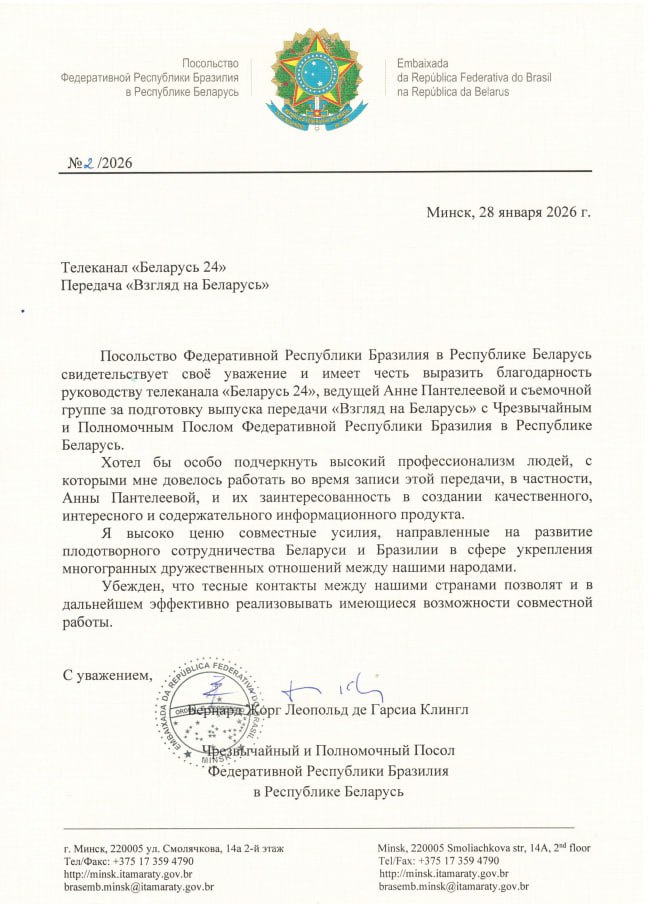 Посольство Бразилии в Беларуси выражает благодарность Телеканалу «Беларусь 24» за подготовку выпуска передачи «Взгляд на Беларусь»