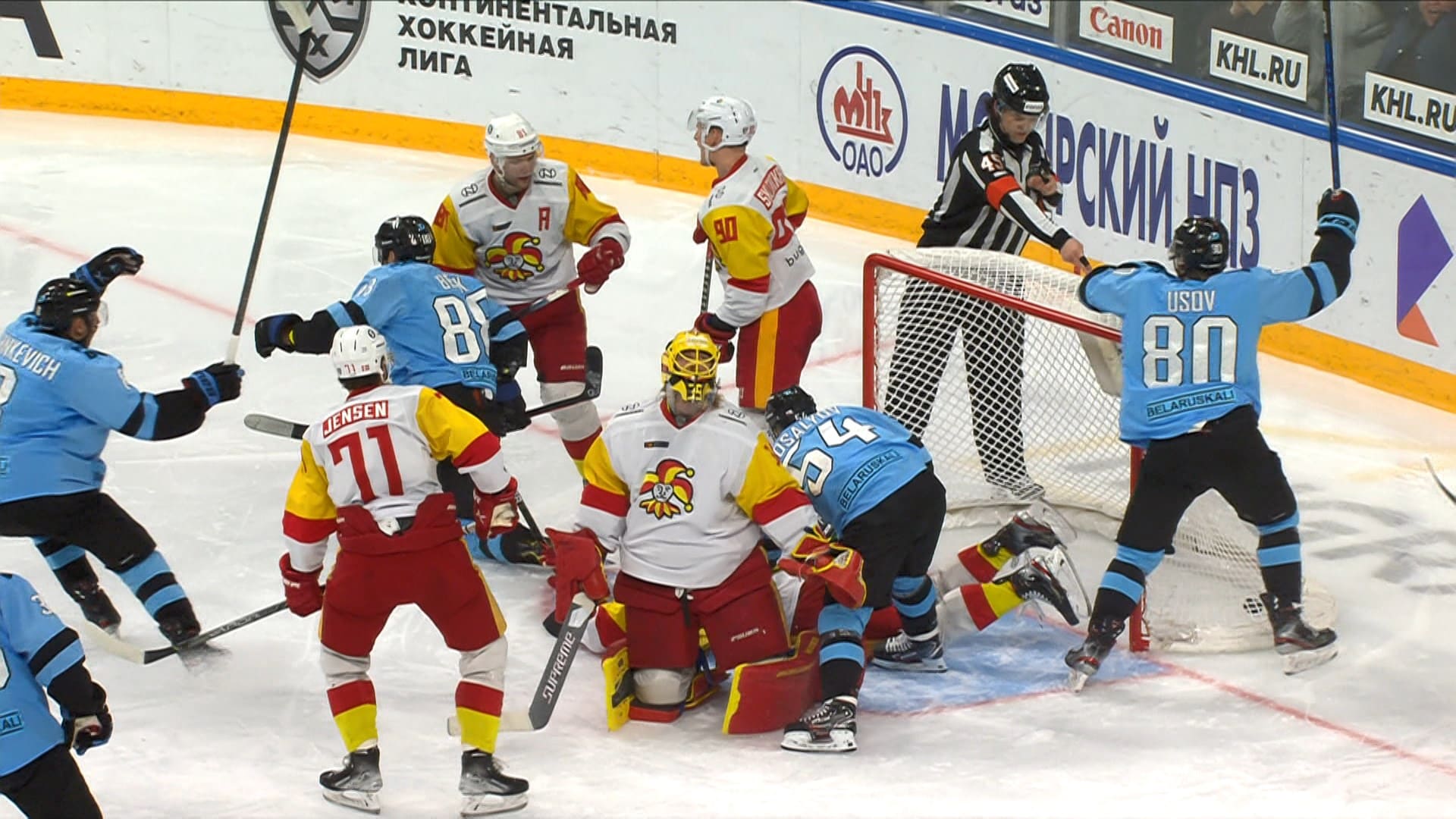 HOCKEY PLAYERS OF DYNAMO MINSK BEAT YOKERIT FROM HELSINKI IN THE KHL CHAMPIONSHIP MATCH.