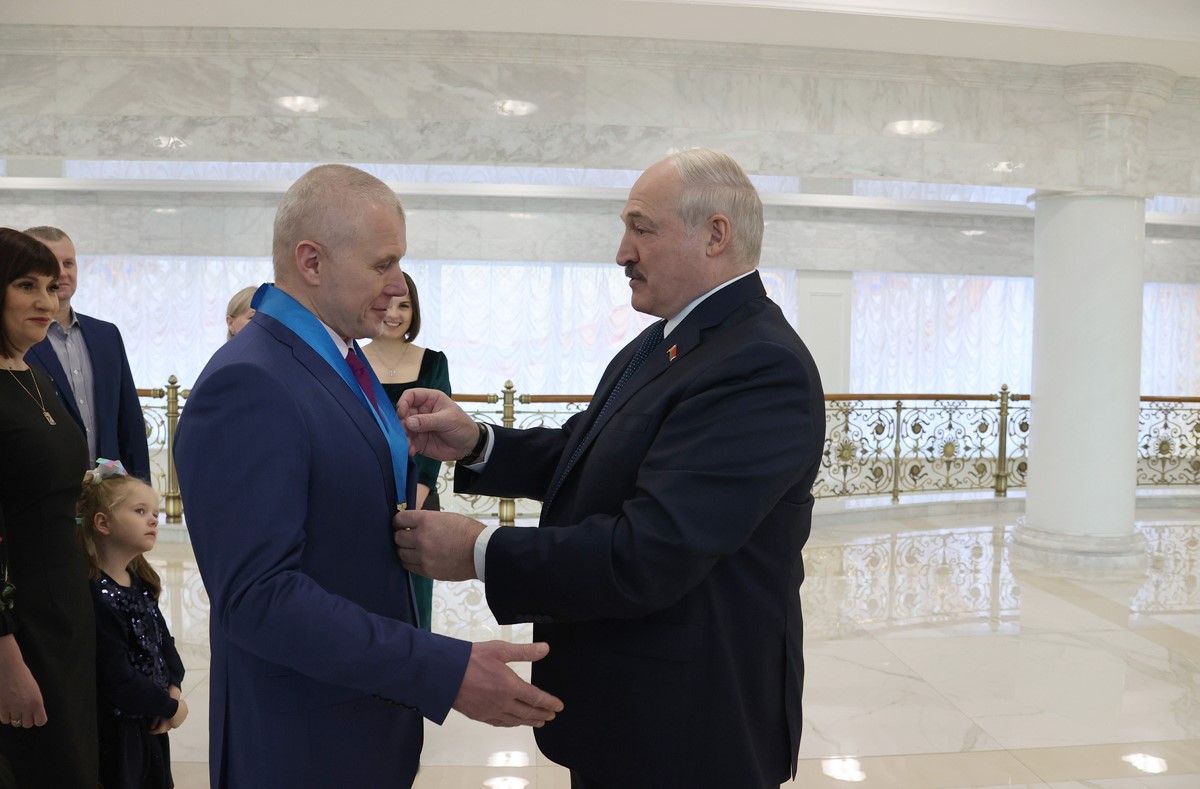 ALEXANDER LUKASHENKO HANDED THE COSMONAUT OLEG NOVITSKY THE ORDER OF PEOPLE'S FRIENDSHIP.