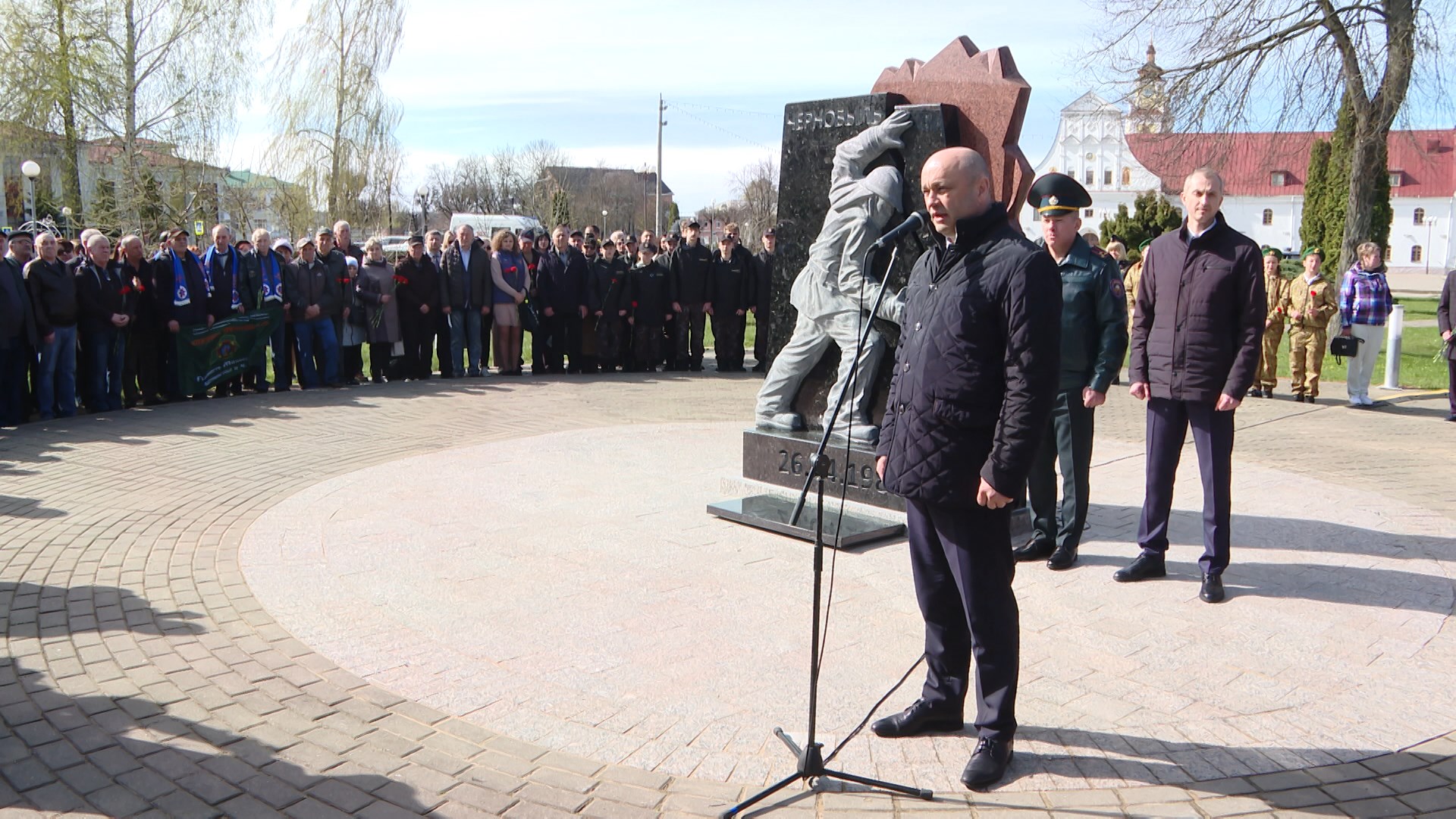 The new monument is the result of a civic initiative by city residents, which received support from local authorities. The composition was installed in the city park. On the pedestal is a figure of a firefighter covering a crack in the slab. The word "Chernobyl" is prominently displayed at the top of the slab, and the "Radiation" sign is in the lower corner. A red granite element symbolizes fire. The new monument is intended to commemorate the courage of these people and serve as a reminder to future generations of the cost of technological progress. More than 200 Chernobyl cleanup workers live in the Orsha District of the Vitebsk Oblast.